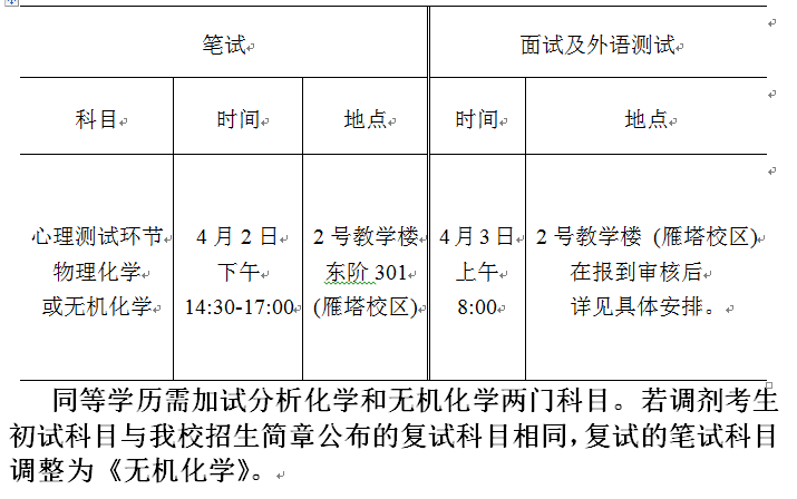 若调剂考生初试科目与我校招生简章公布的复试科目相同,复试的笔试科目调整为《无机化学》。